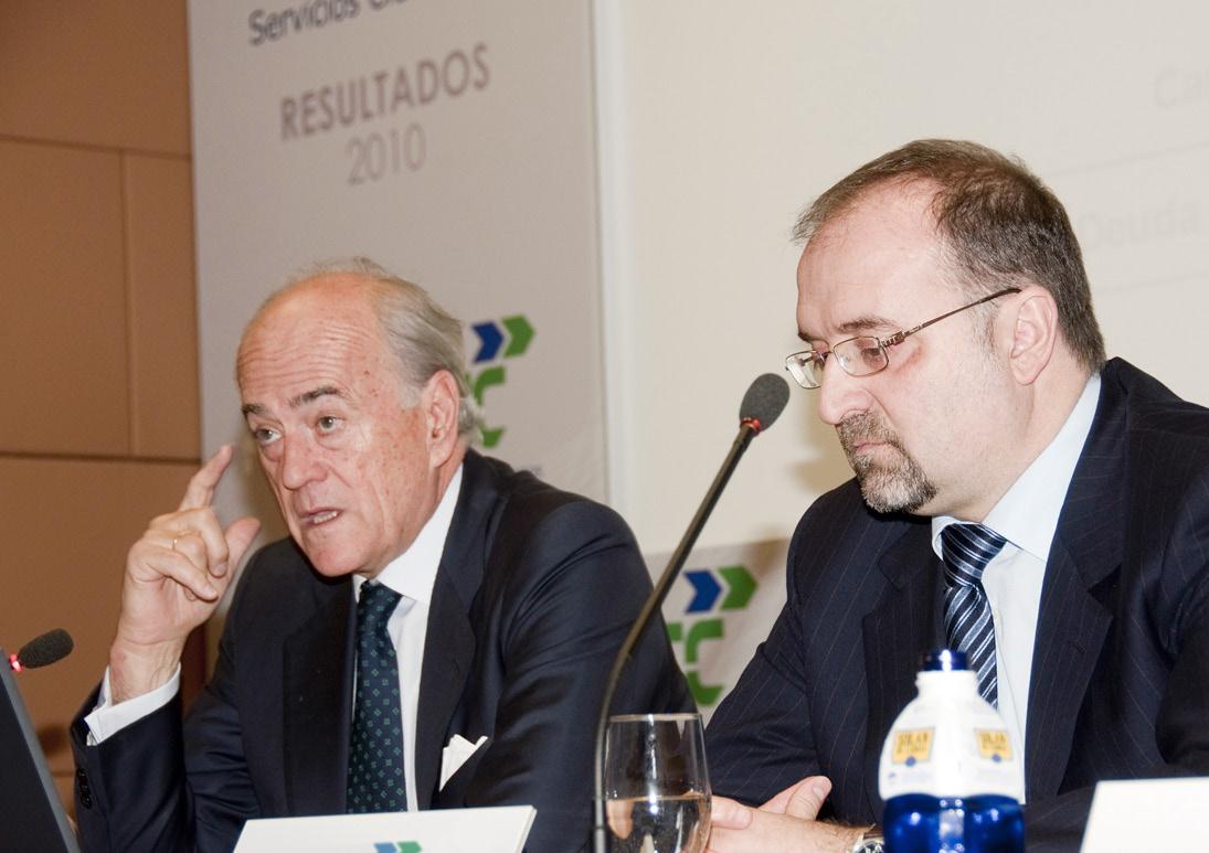 Baldomero Falcones, presidente y consejero delegado del Grupo FCC, en la presentación de los resultados de 2010, junto al director general de Finanzas Víctor Pastor.